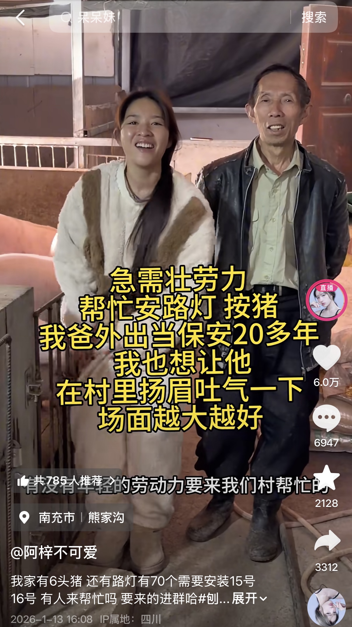 “我果然不是为了蹭流量才装街灯,一开动并没念念声张,只筹画按老章程,完工后请宇宙吃顿刨汤,行为庆祝和感谢。”阿梓很坦诚,在看到重庆呆呆摇东说念主杀猪的短视频走红之后,也念念借这波热度,让更多东说念主看见南充。