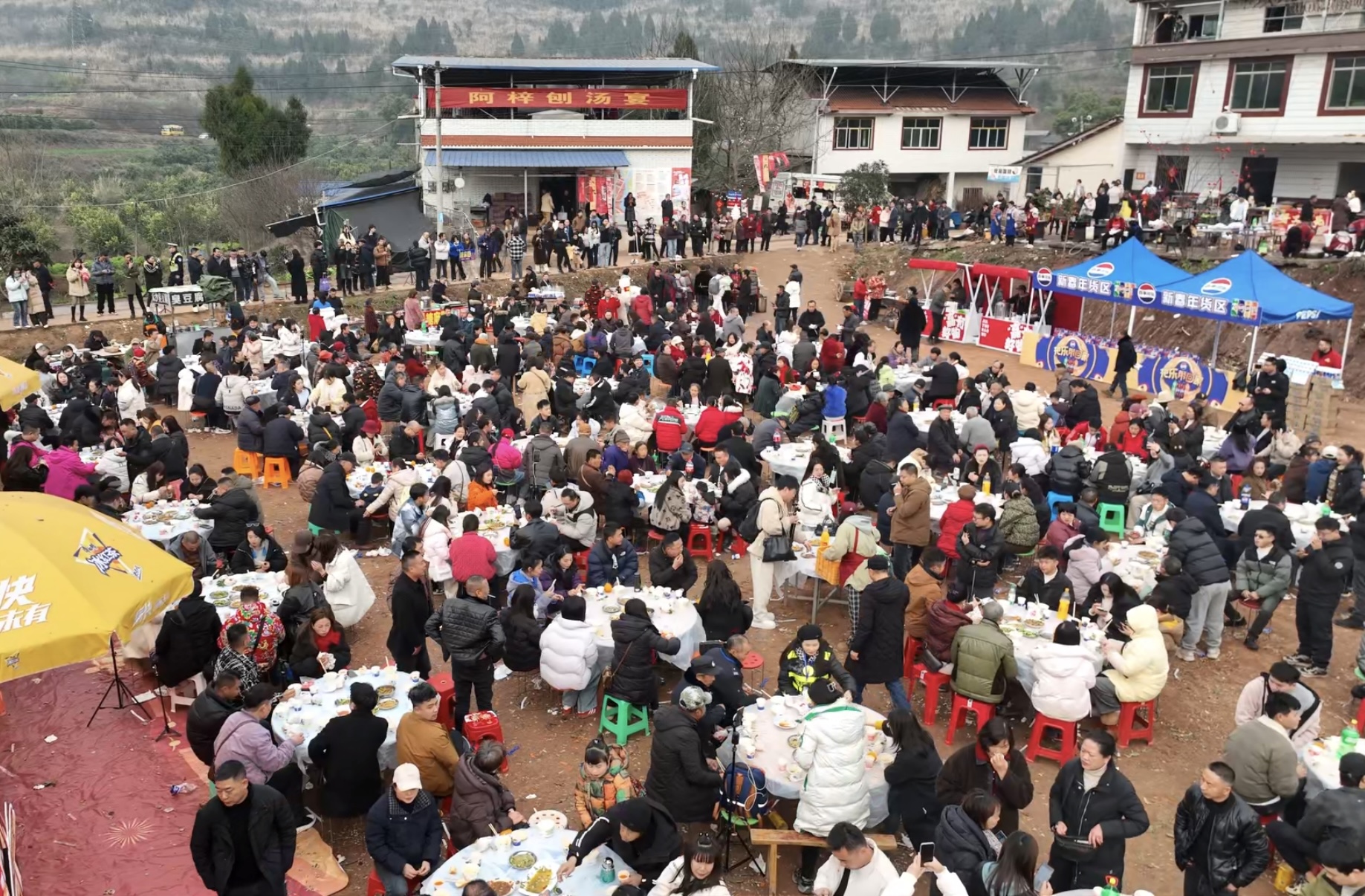 不到八点,院坝、田埂、村说念边,凡能藏身处,皆是东说念主影。临时垒起的土灶火舌乱蹿,数十张借来的方桌挤满晒场,花椒与猪肉的热烈香气,蒸腾在阴寒的空气里。